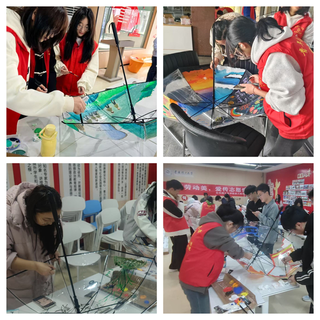 三月芳菲浸校园,雷锋精神永流传。东华理工大学信息工程学院近日以'学雷锋'主题为契机,创新推出'伞聚劳动美,爱传志愿情'劳动实践活动,通过'劳动+美育+心理'的跨界融合,在绵绵春雨中绘就了一幅立德树人的生动画卷。3月16日,由学院党委统筹指导,'渠田'劳动育人工作室精心策划的彩绘雨伞活动,在'一站式'学生社区与软件楼同步展开,60名学子执笔绘心,将劳动体验与自然探索深度融合,开启了一场滋养心灵的沉浸式成长之旅。